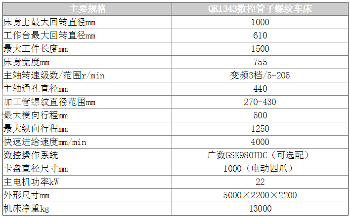 QK1343型數(shù)控管螺紋車床是針對(duì)石油、化工、冶金行業(yè)輸油管、鉆桿、套管的螺紋加工要求專業(yè)化設(shè)計(jì)制造。機(jī)床采用雙卡盤夾緊方式,數(shù)控系統(tǒng)自動(dòng)控制,可******加工各種內(nèi)、外螺紋,并具有普通數(shù)控車床的功能
