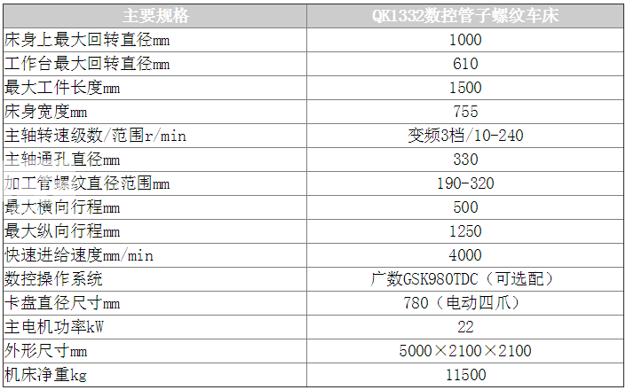 QK1332型數(shù)控管螺紋車床是針對石油、化工、冶金行業(yè)輸油管、鉆桿、套管的螺紋加工要求專業(yè)化設(shè)計制造。機床采用雙卡盤夾緊方式,數(shù)控系統(tǒng)自動控制,可******加工各種內(nèi)、外螺紋,并具有普通數(shù)控車床的功能。
