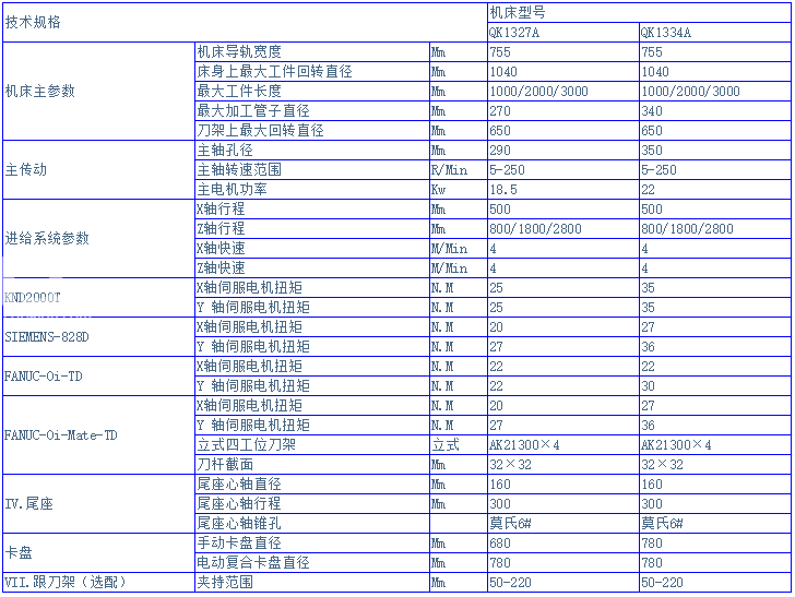 QK1327A,QK1334A機(jī)床為臥式平床身數(shù)控管螺紋車床,采用半閉環(huán)控制。車削主傳動(dòng)為無級(jí)變速,兩個(gè)聯(lián)動(dòng)控制軸,Z軸和X軸采用滾珠絲杠副加交流伺服電機(jī)實(shí)現(xiàn)縱向和橫向移動(dòng),具有很好的定位精度和重復(fù)定位精度。